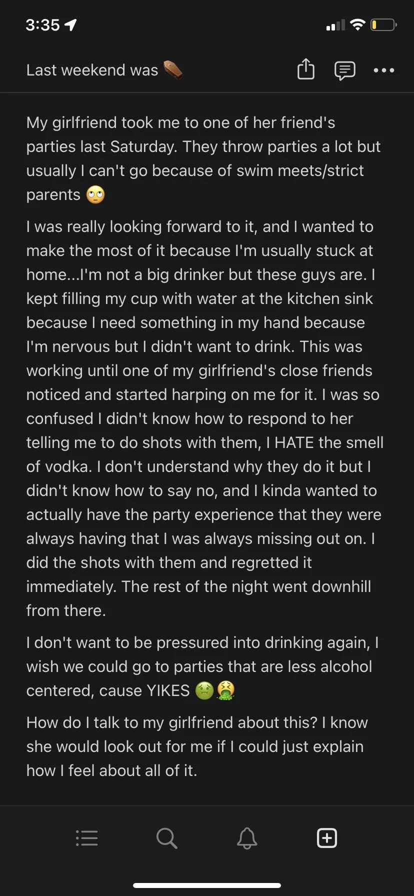 Then I would have a real conversation with your GF about your boundaries. It can be scary but also super helpful to share your hard feelings with someone you trust- it can actually bring you closer. You two can maybe come up with strategies to deal with parties, together. Either way, you’ve made it clear what you’re willing to deal with and where you’re uncomfortable, which is super healthy and a huge step in becoming the person you want to be.